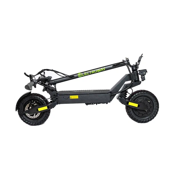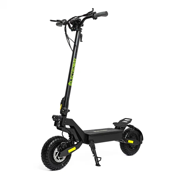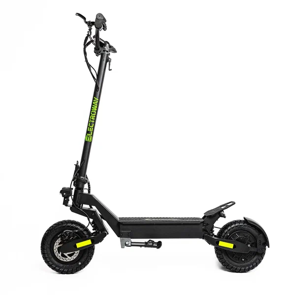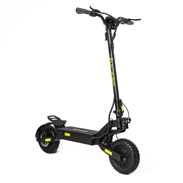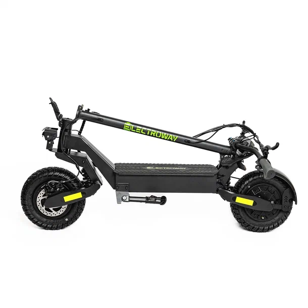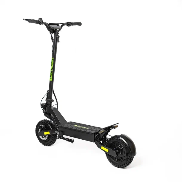 Электрический самокат Electroway F3 оснащен двумя электродвигателями суммарной номинальной мощностью 2400 Вт, что обеспечивает его максимальную скорость до 70 километров в час. Полный привод самоката обеспечивает уверенное управление и устойчивость на любых дорожных покрытиях.