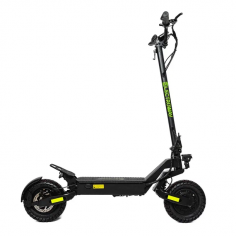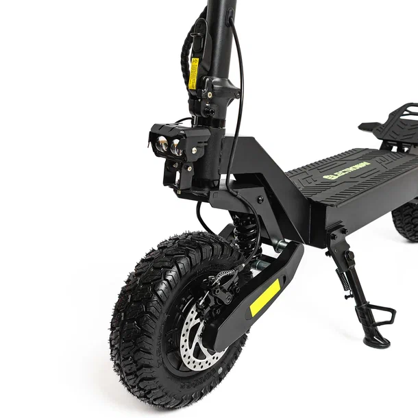 Самокат оборудован пневматическими колесами диаметром 11 дюймов и системами амортизации передней и задней подвески, что гарантирует высокий уровень комфорта и плавность хода.