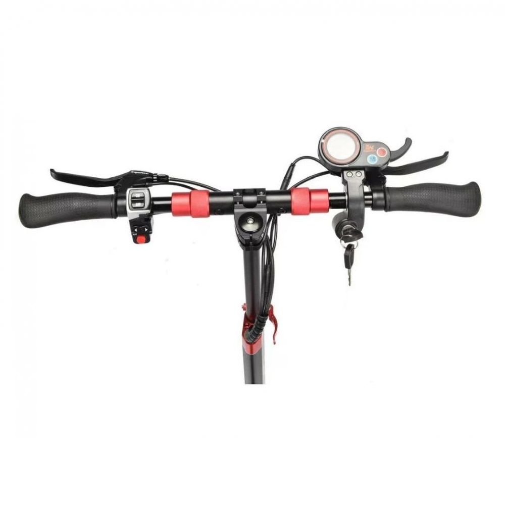 Тормозная система: Электросамокат оборудован дисковыми механическими тормозами, которые приводятся в действие с помощью рукояток на руле. Это обеспечивает высокую эффективность торможения и безопасность при движении.