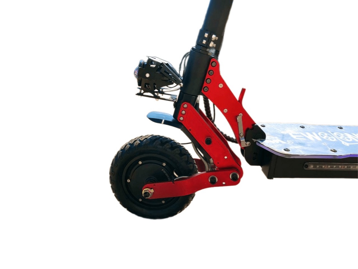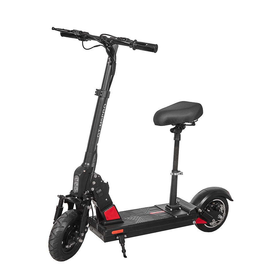 Электросамокат оснащён сиденьем и колёсами диаметром 10 дюймов. Модель имеет улучшенную переднюю подвеску, мощный задний амортизатор и надувные колёса с агрессивно-дорожной резиной.