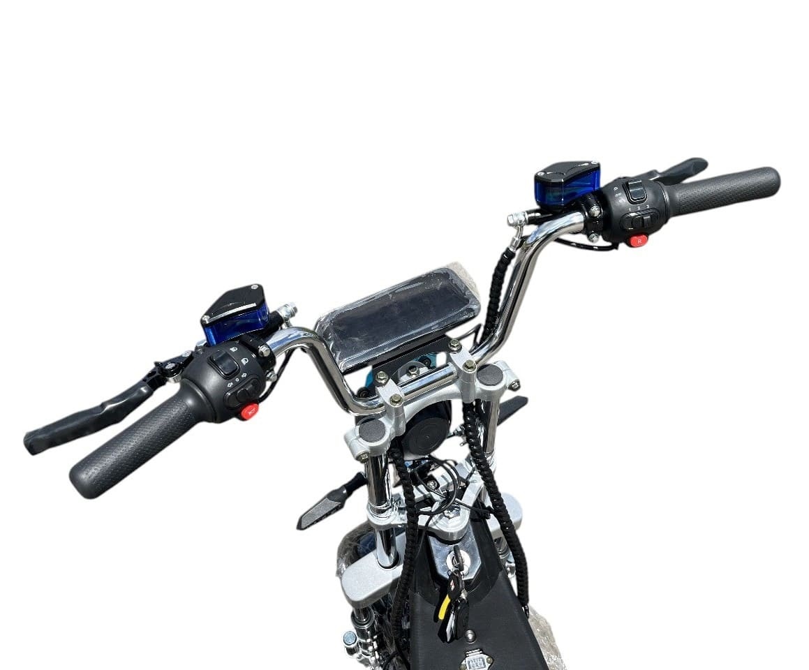 Для безопасной езды скутер оборудован регулируемыми дисковыми тормозами спереди и сзади, а также прочной стальной рамой, способной выдерживать значительные нагрузки. Габариты устройства — 1750х600х1200 с колесной базой 1280 мм, что обеспечивает устойчивость и удобство при езде. Вес модели составляет 70 кг, и она способна выдерживать максимальную нагрузку до 200 кг, что подходит как для одного, так и для двух райдеров.