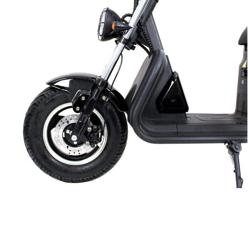 Стальная рама электроскутера, изготовленная из высокопрочных сплавов, обеспечивает исключительную надежность и долговечность конструкции. Использование колес диаметром 10 дюймов с агрессивным протектором гарантирует высокую проходимость и плавность хода, что особенно важно в условиях эксплуатации на неровных дорожных покрытиях. Дисковая тормозная система, установленная как спереди, так и сзади, характеризуется высокой эффективностью и обеспечивает надежное и безопасное торможение, что существенно повышает уровень безопасности пользователя.