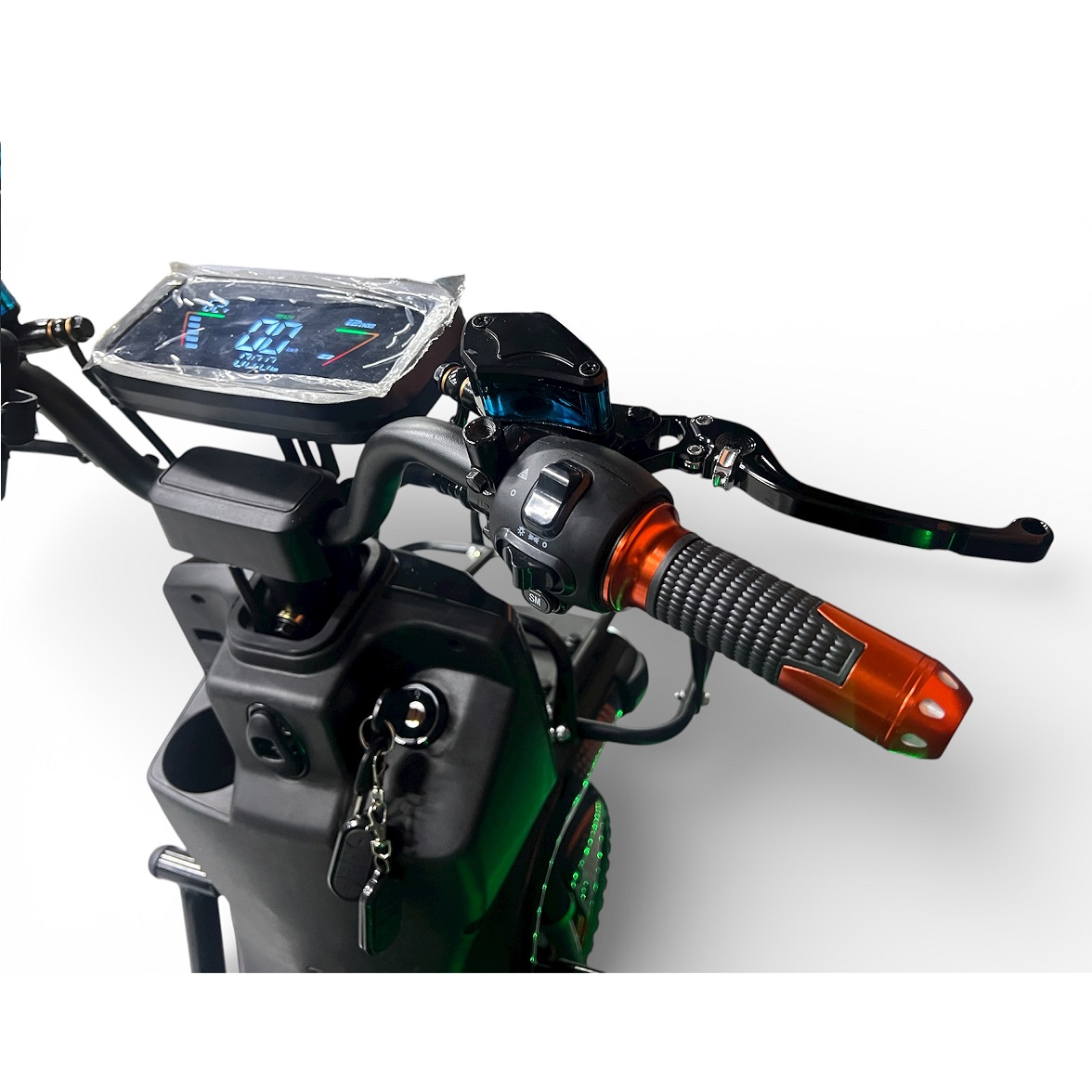 Сигнализация и дистанционный запуск с брелка защищают от угона и позволяют быстро блокировать мотор-колесо.