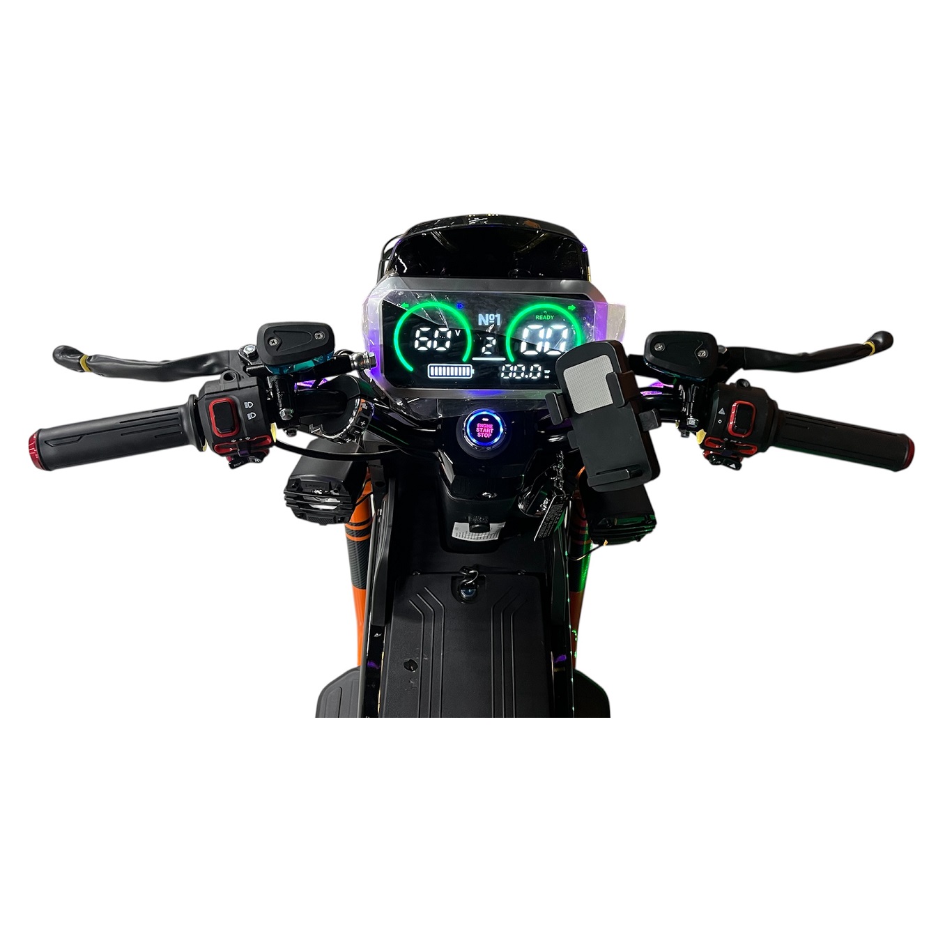 Электроскутер оснащен мотором 1600 Вт, благодаря которому развивает скорость до 60 км/ч и легко преодолевает подъемы.